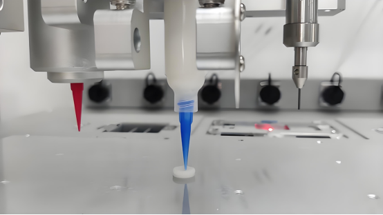 图:生物墨水(细胞与水凝胶的混合体)被精密打印头挤出,在三维空间中逐层堆积成型。